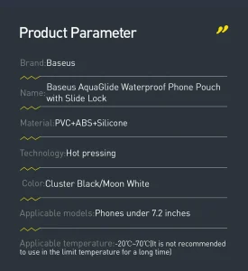 - მოდელი: AquaGlide Waterproof Phone Pouch with Slide Lock Cluster Black