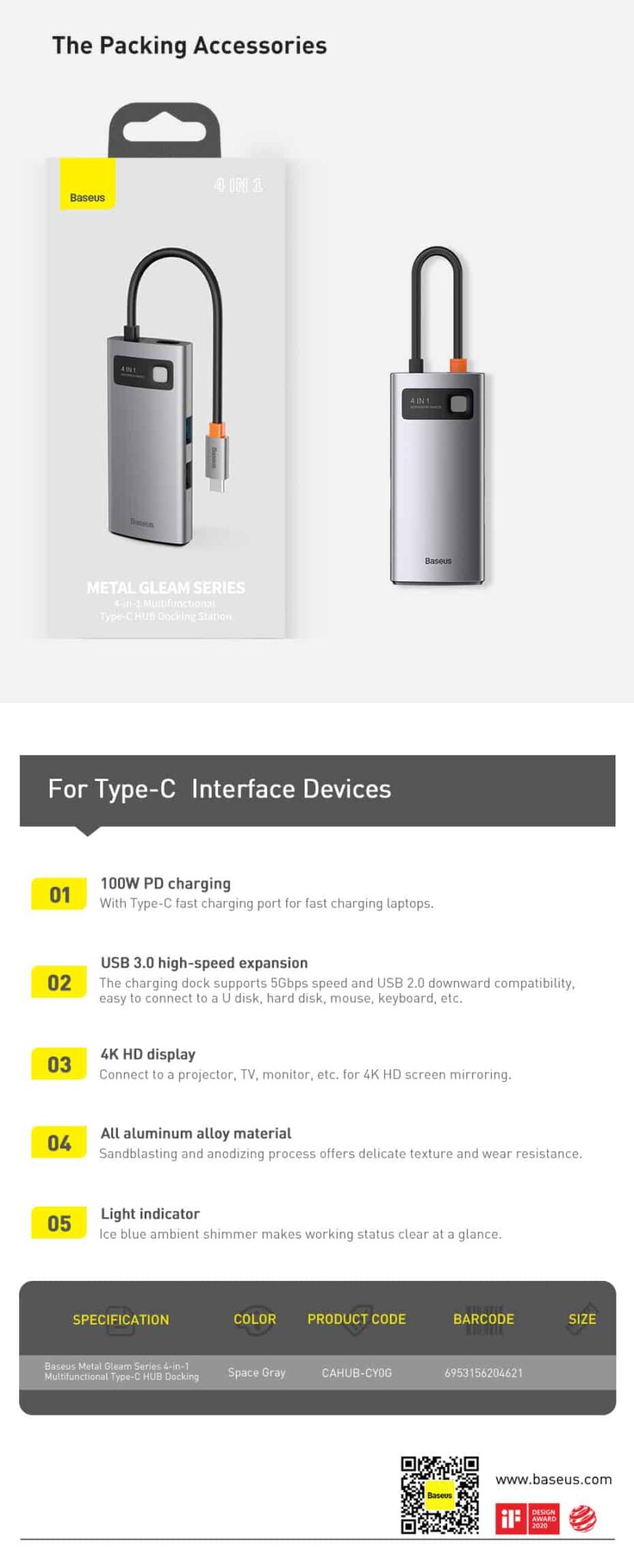 Baseus Hub Type-C 4 in 1 with 1 USB 3.0, 1 USB 2.0, 1 HDMI CAHUB-CY0G